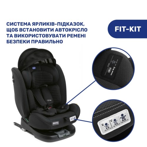 • Система ярликів Fit-Kit – універсальна система ярликів, які швидко зорієнтують, як правильно встановити автокрісло та як користуватися системою безпеки.