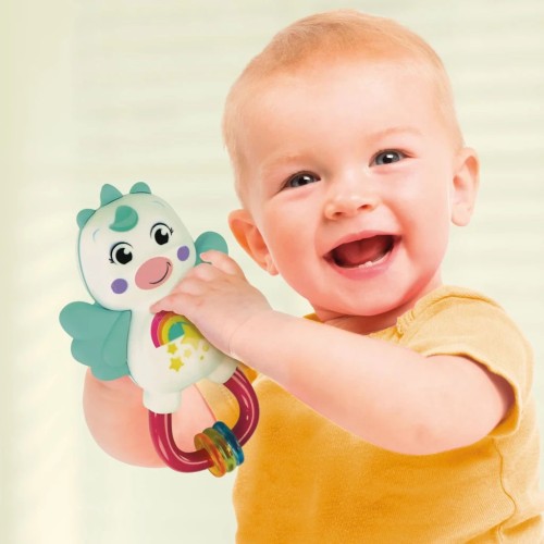 • вбудоване брязкальце видає потішні звуки при струшуванні – розважає та сприяє розвитку слухового сприйняття;
