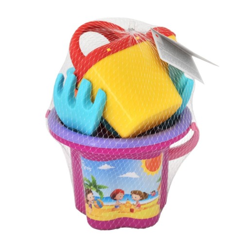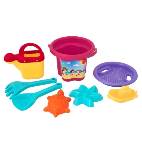 Відерце створено у вигляді квіточки, що дозволяє створювати особливо цікаві башточки.Сито, грабельки, лопатка і 3 оригінальні формочки теж дуже знадобляться маленькому творцеві пісочних конструкцій.