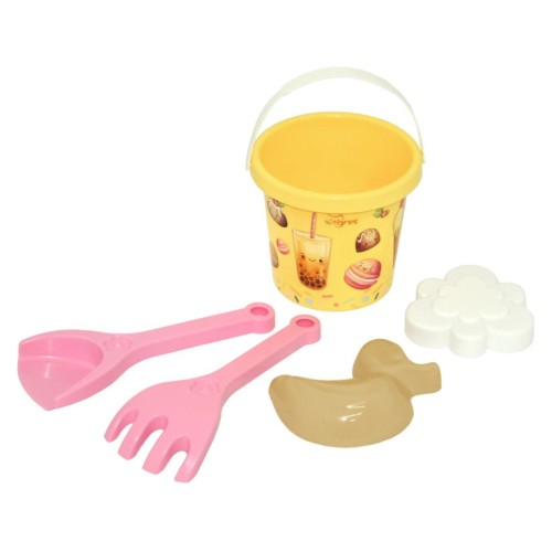 До набору входять: відеречко ємністю 1 л, лопатка, граблі та 2 формочки для піску.