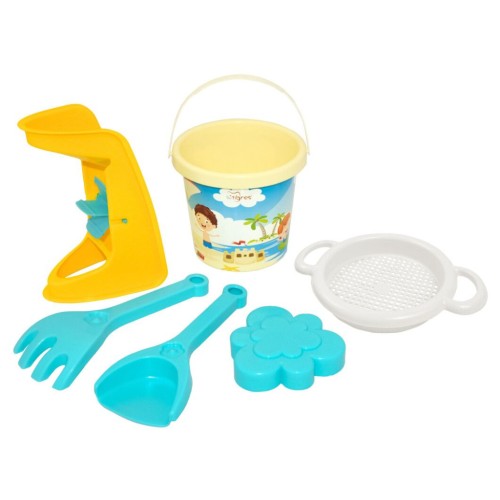 До набору входять: відеречко ємністю 1 л, лопатка, граблі, формочка для піску, ситечко і млинок.