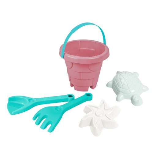 Набір для піску "Вежа еластична" 5 ел. складається з відерця-вежа, яке може виконувати функцію формочки для зведення пісочних замків, лопатки, грабельок і двох пасочок.