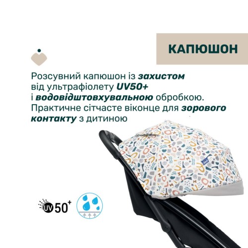 • Розсувний капюшон з водовідштовхувальною обробкою та захистом від ультрафіолету UV50+. Сітчасте віконце у капюшоні, щоб наглядати за МАлюком.