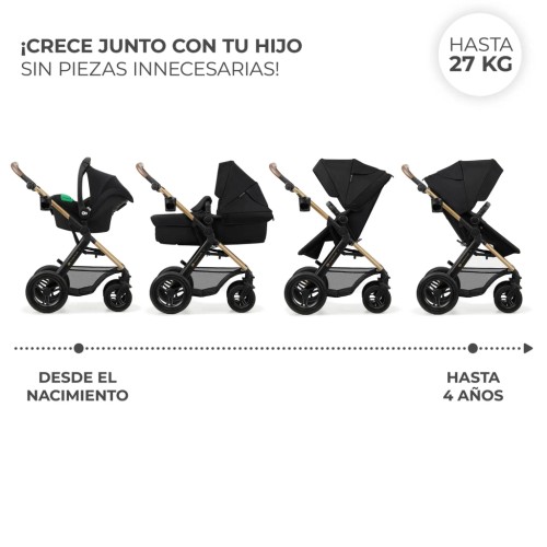 Коляска розрахована на вагу до 27 кг, підходить з народження і оснащена всіма необхідними аксесуарами: 5-точковими ременями безпеки, регульованим бампером, містким кошиком і легко складною рамою.