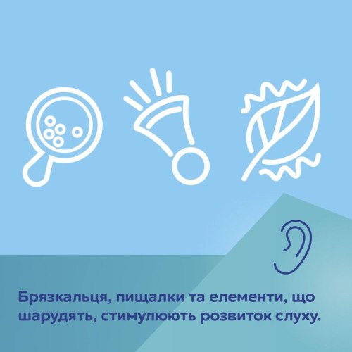 • Брязкальця, пискавки та елементи, що шарудять стимулюють розвиток слуху.