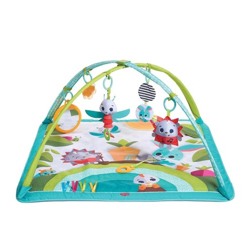 Розвивальний маленький килимок Весела галявина призначений для дітей від народження. У комплекті 5 іграшок із різними функціями: музична іграшка Їжачок, безпечне дзеркальце, брязкальце, прорізувач, мінімобіль із шарудними елементами, іграшка-стрибунець. На ігровому просторі килимка використовуються матеріали різних фактур для розвитку дрібної моторики й органів чуття малюка. Дуги фіксуються в декількох положеннях, що дає змогу розсовувати іграшки по сторонах або над дитиною.