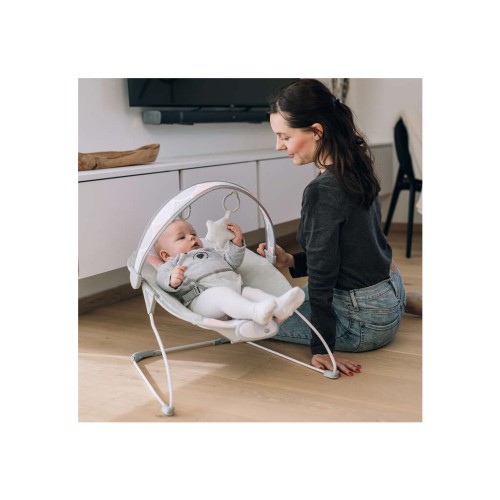 Іграшки на ігровій дузі привертають увагу малюка і спонукають до гри. Ніжні вібрації та мелодії(8) ще більше привертають увагу малюка. Баунсер має 3-точковий ремінь безпеки для безпечного використання.
