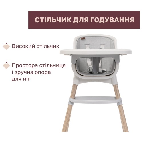2. Низький стільчик зі спинкою для розваг, відпочинку та перекусів. Від'єднайте нижню частину ніжок і використовуйте стільницю та ремені безпеки. Також стільчик можна використовувати без аксесуарів.