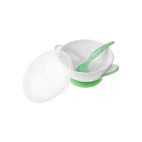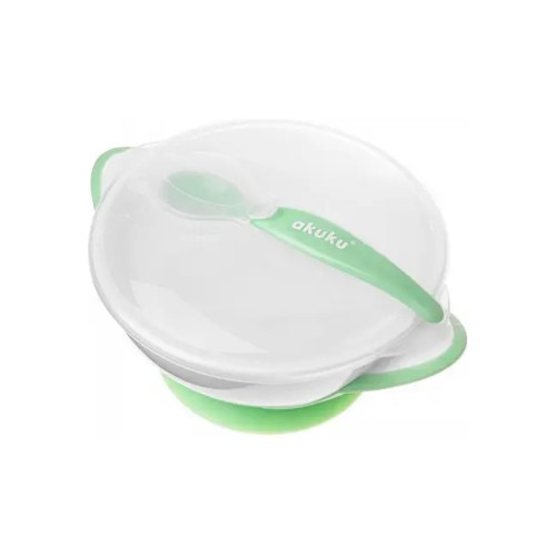 Набір дитячого посуду Akuku тарілка на присосці з ложкою, білий-зелений (A0504)