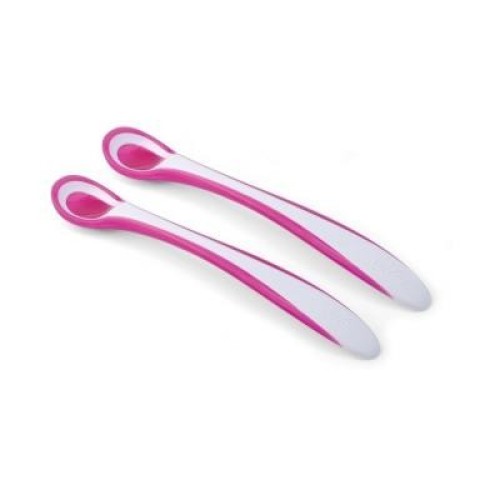 Набір двох термочутливих ложечок яскравого рожевого кольору від італійського виробника Nuvita. Контактуючи з продуктами із температурою понад 37°C, ложечка змінюватиме свій колір на блідий. Ложкою дуже зручно користуватись, завдяки довгій ручці - чи то широка тарілка, чи то глибока пляшка. Ложечки вироблені із міцного і нетоксичного пластику, без бісфенолу-А та фталатів. Рекомендовано для малюків з 6-ти місяців.