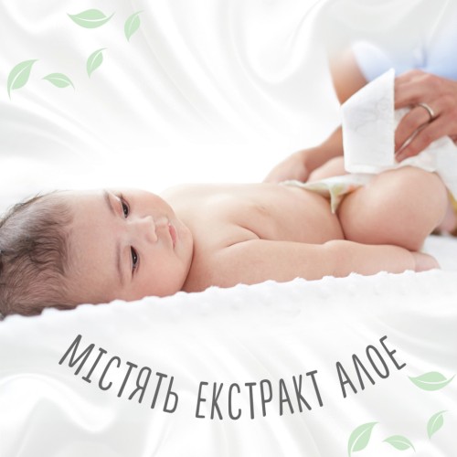 Особливості: просочені очищеною водою. Не містить: ароматів, спирту, парабенів. Натуральні компоненти - целюлоза. Виготовлені за особливою технологією Коформ. PH - збалансовані. Гіпоалергенні, підходять для новонароджених. Без «липкого ефекту» після використання. Містять екстракт Алое для натуральної захисту шкіри малюка.