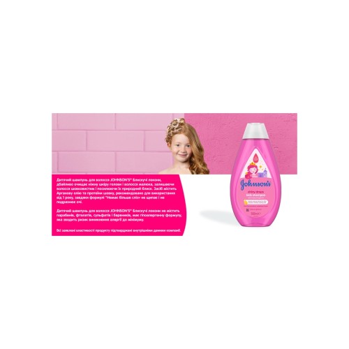 Johnson’s із серії Блискучі локони розроблений на основі спеціальних мийних компонентів, які не викликають сльоз навіть у разі випадкового попадання в очі. Склад також збагачений натуральним екстрактом шовку та аргановою олією. Такі компоненти надають волоссю м’якості й шовковистості, роблять його гладким. Основні переваги продукту: