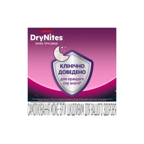 Нічні трусики DryNites від Huggies - це спеціальні трусики-підгузки для хлопчиків і дівчаток від 4-х і до 13+ років. Вони розроблені для діток та підлітків, у яких трапляються випадки нічного нетримання. Завдяки еластичним боковинкам трусики щільно прилягають та не протікають, забезпечують комфорт.