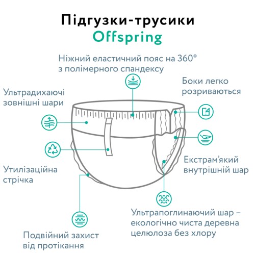 Offspring виділяються своїми інноваційними японськими технологіями, що поєднують 11 шарів суперабсорбенту, дозволяючи утримувати вологу до 12 годин. Це зберігає шкіру малюка сухою і комфортною протягом усього дня. М'якість та повітропроникність пелюшок створюють неперевершений комфорт, а спеціальні еластичні бортики запобігають протіканням, забезпечуючи спокійний сон та активні години гри.