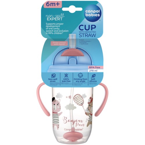 Кухоль-непроливайка Canpol babies Bonjour Paris з трубочкою та обтяжувачем підтримує правильний розвиток ротової порожнини, мови та прикусу у 99% дітей*. Це ідеальний вибір для дітей, які починають навчатися пити самостійно. Підходить для дітей від 6 місяців!