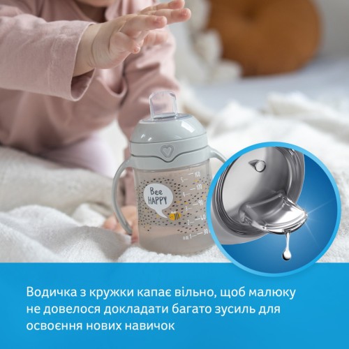 Водичка з кухля капає вільно, щоб малюкові не довелося докладати багато зусиль для опанування нових навичок.