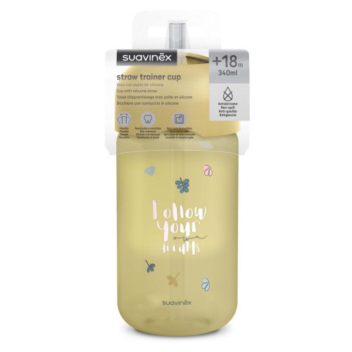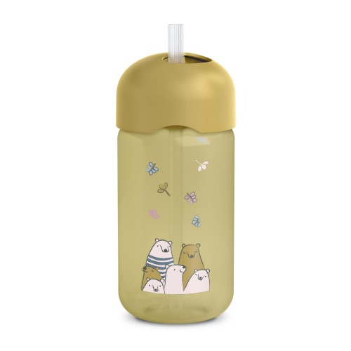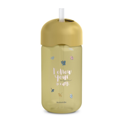Пляшка з трубочкою має систему захисту від проливання. Кришка, що закручується, приховує соломинку, зберігаючи її чистою, коли вона не використовується. Має ергономічну форму, що підходить для маленьких дитячих ручок. Під час пиття м'яка силіконова трубочка не подразнює ротову порожнину та ясна дитини і стійка до прокушування зубами.