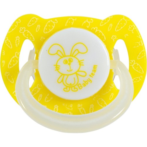 Соска пустушки виготовлена з натурального латексу — міцного, м’якого та еластичного матеріалу. Відкрита форма дає максимальний доступ повітря до шкіри малюка, у такий спосіб уникаючи подразнення. Має кільце, що світиться у темряві. Пустушки Baby team виготовлені з високоякісних і безпечних матеріалів, а також не містять шкідливих речовин і Бісфенол А.