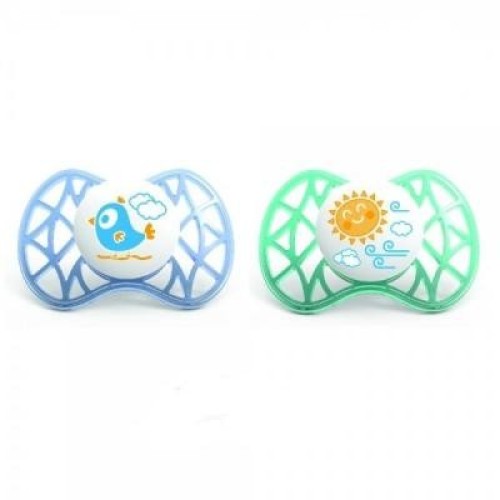 Набір із двох симетричних пустушок. Одна зеленого кольору, із зображенням сонечка, інша – блакитного, із пташечкою. Педіатри рекомендують використовувати пустушку для немовлят. Такий атрибут заспокоює дитину, забезпечує заспокійливу і розслабляючу дію для дитини, сприяє правильному розвитку піднебіння, ротової порожнини. Пустушка Nuvita з інноваційною формою та матеріалом адаптована до віку дитини та її природніх потреб. Виріб можна стерилізувати. Для дітей від 6 місяців.