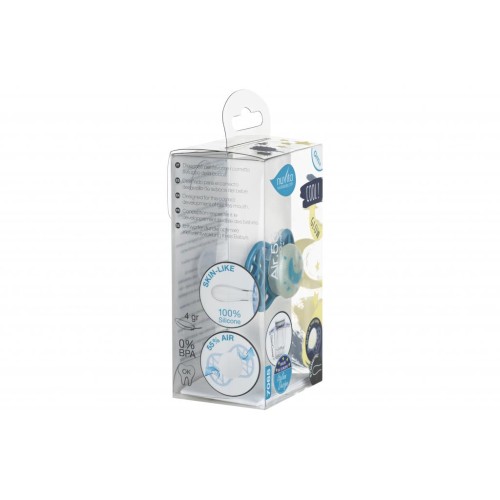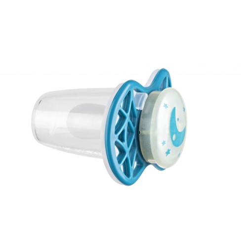 Пустушка симетрична Nuvita NV7065 Air55 Cool 0m + "місяць" світиться в темряві бірюзова. Пластина соски на 55% складається з повітря забезпечуючи майже повну аерацію області навколо рота, уникаючи скупчення слини, яка може подразнювати шкіру. Захисний ковпачок для соски для підтримки чистоти соски і стерилізації в мікрохвильовій печі простим додаванням води.