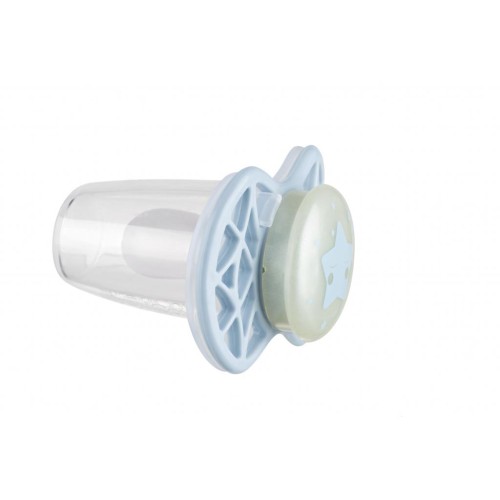 Симетрична пустушка серії Nuvita Air55 Cool. Пластина соски на 55% складається з повітря забезпечуючи майже повну аерацію області навколо рота, уникаючи скупчення слини, яка може подразнювати шкіру. Захисний ковпачок для соски для підтримки чистоти соски і стерилізації в мікрохвильовій печі простим додаванням води.
