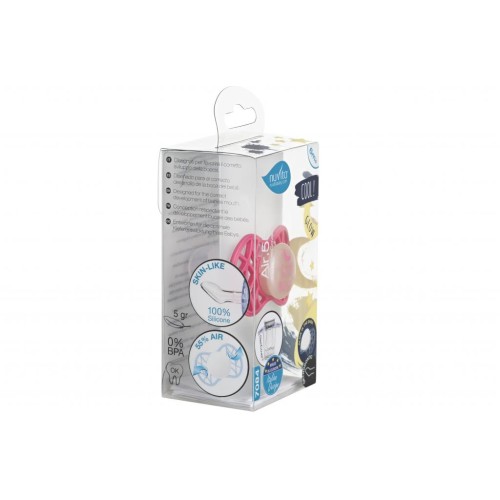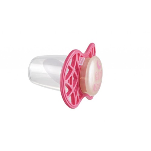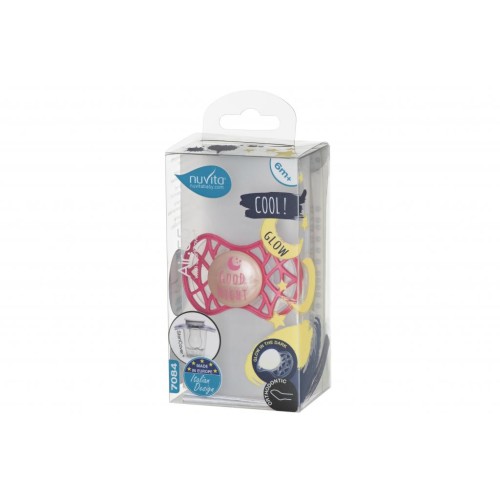Ортодонтична пустушка Air55 Cool, яка світиться в темряві. Пластина соски на 55% складається з повітря забезпечуючи майже повну аерацію області навколо рота, уникаючи скупчення слини, яка може дратувати шкіру. Захисний ковпачок для соски для підтримки чистоти соски і стерилізації в мікрохвильовій печі простим додаванням води.