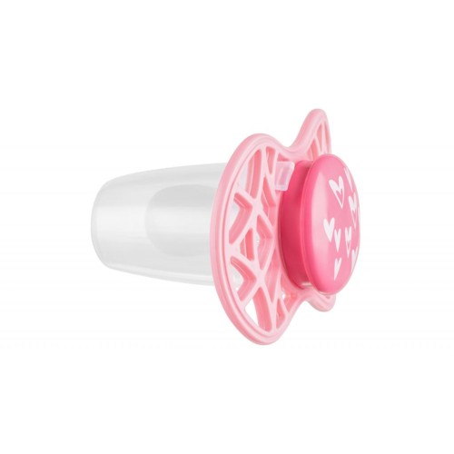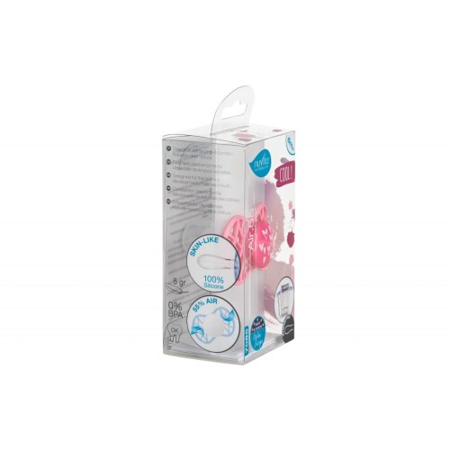 Пустушка симетрична Nuvita NV7085 Air55 Cool 6m + "сердечка" рожева. Пластина соски на 55% складається з повітря забезпечуючи майже повну аерацію області навколо рота, уникаючи скупчення слини, яка може подразнювати шкіру. Захисний ковпачок для соски для підтримки чистоти соски і стерилізації в мікрохвильовій печі простим додаванням води.
