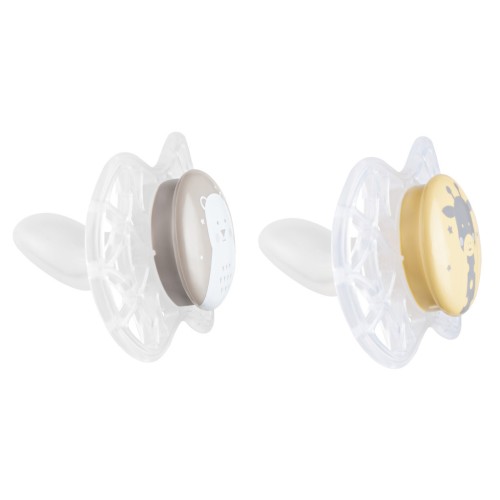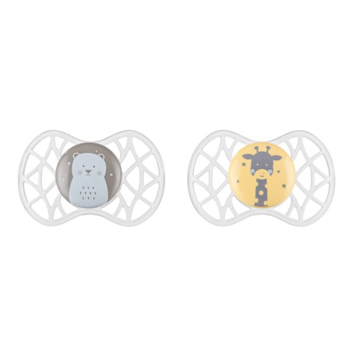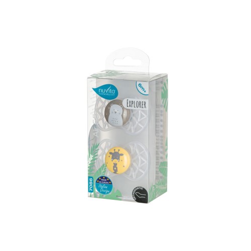 Пустушка Nuvita NV7086 Air55 Explore ортодонтическая 6m + (ведмедик, жираф). Пластина соски на 55% складається з повітря забезпечуючи майже повну аерацію області навколо рота, уникаючи скупчення слини, яка може подразнювати шкіру.