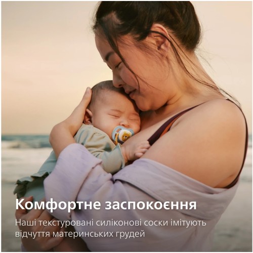 Спеціальна форма пустушки для комфортного смоктання. Конструкція пустушки легка, має закруглені краї та надзвичайно великі отвори, які лагідно пропускають повітря до шкіри дитини, щоб вона залишалась м'якою та сухою.