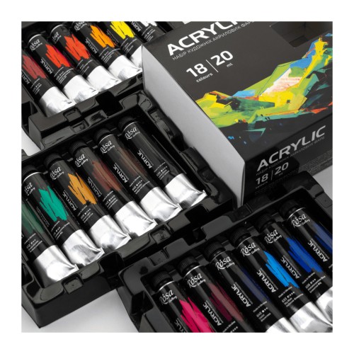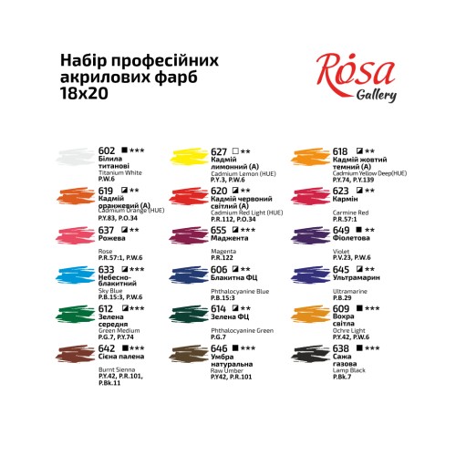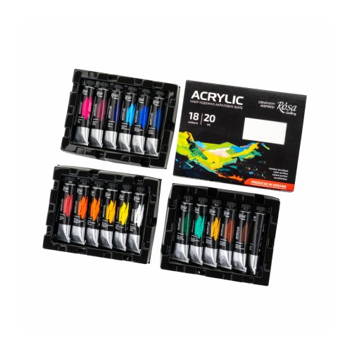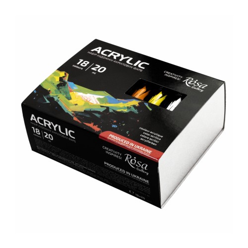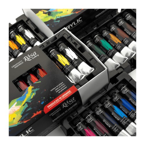 Художні акрилові фарби ROSA - тонкотерті фарби, виготовлені з якісних пігментів та з використанням сучасних акрилових дисперсій, що забезпечує високу еластичність шару фарби після висихання, робить його стіким до коливання температур та рівня вологості. Сучасні матеріали дозволяють подовжити час висихання фарби, що дає можливість художнику вносити правки під час роботи та розширює можливості акрилового живопису.