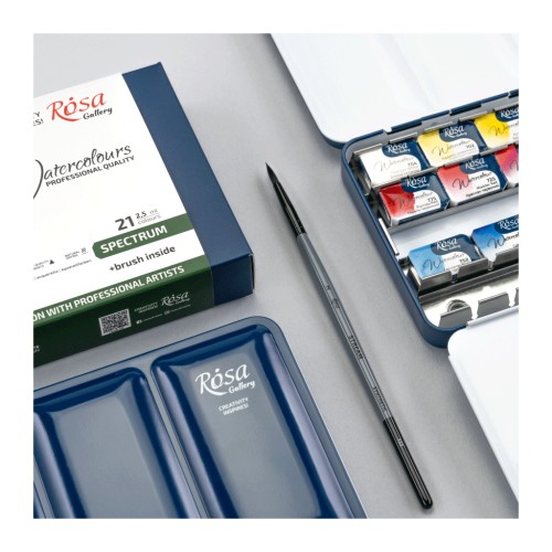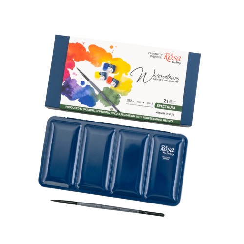 Акварельні фарби Rosa Gallery SPECTRUM, 21*2,5мл, з пензлем, кювета Індіго металевий пенал (4823098544777)