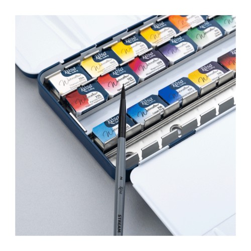 Характеристики професійних акварельних фарб ROSA Gallery в наборах: - Натуральний гуміарабік забезпечує відмінну адгезію та рознесення акварельних фарб - Тонкотерті натуральні та синтетичні пігменти гарантують максимальну чистоту та прозорість фарб - Висока концентрація пігменту дозволяє отримати широку розтяжку кольору від максимально насиченого до повітряно прозорого - Класична технологія природнього сушіння акварелі забезпечує її легке розчинення водою та набір фарби на пензель - В металевий пенал вбудовані дві палітри різної конфігурації, спеціальна вставка для кювет та зручний фіксатор для пальця, що дозволяє легко утримувати набір фарб у руці під час роботи - Завдяки невеликому розміру пенал можна переносити у сумці або етюднику Завдяки стильному дизайну обгортки та металевому пеналу з кришкою-палітрою набори акварельних фарб ROSA Gallery в кюветах стануть вишуканим подарунком для професійного художника.