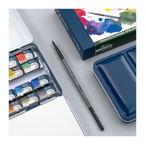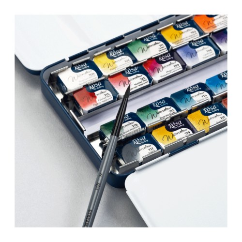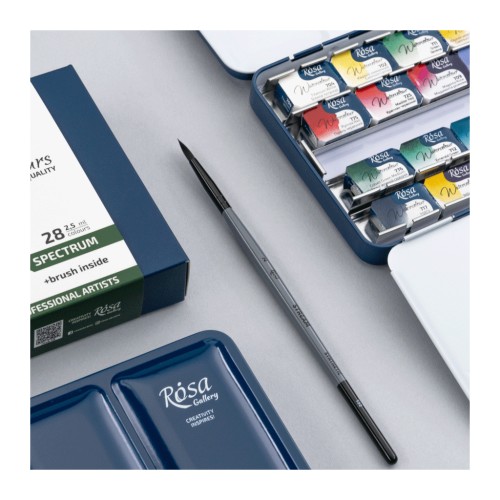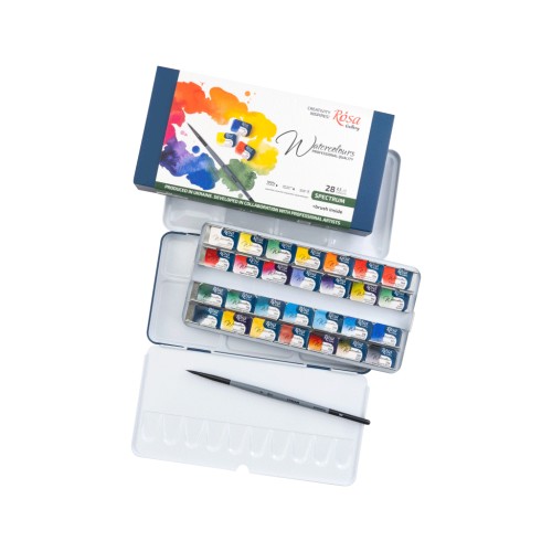 Акварельні фарби Rosa Gallery SPECTRUM, 28*2,5мл, з пензлем, кювета Індіго металевий пенал (4823098544784)