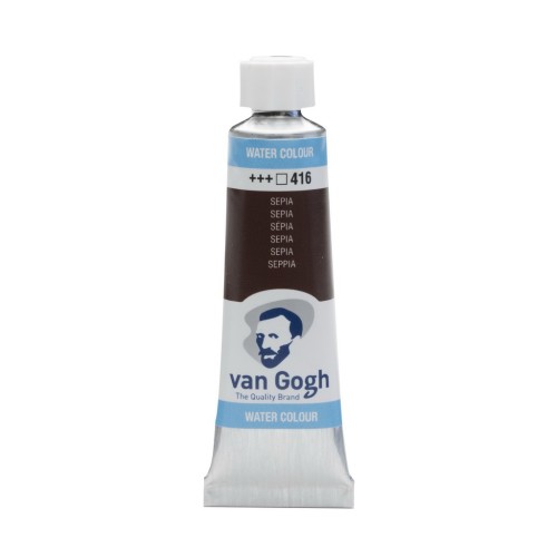 Акварель Van Gogh, кольором Сепія у тубі, це чудовий варіант для художників-акварелістів. Тюбики випускаються заводом-виробником об'ємом 10 мл. В'язкість акварельних фарб, незалежно від кольору, практично однакова, тому комфортність у роботі підвищується. На відміну від кювету, ця фарба видавлюється на палітру, взяти її на пензель можна набагато більше, не потрібно розмивати, як аналогічну в кюветі. Незважаючи на те, що ця акварель вважається напівпрофесійною, якість дуже висока, вона користується попитом і застосовується досвідченими художниками.