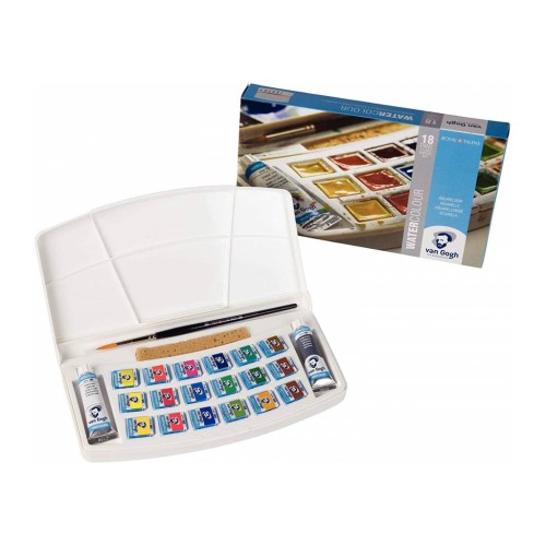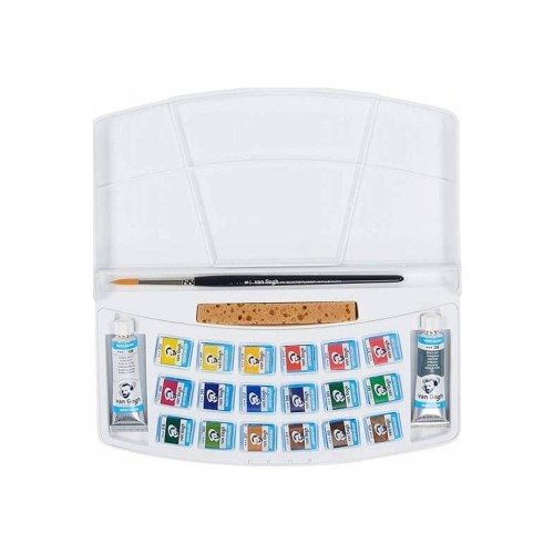 Набір акварельних фарб “Van Gogh”18 кольорів в кюветах та 2 кольори (Біла, Сірий пейна) по10 мл, + пензлик, в пластиковому пеналі.Акварель Van Gogh відрізняється яскравістю і інтенсивністю кольору. Вся палітра Van Gogh має високий ступінь світлостійкості – зберігає яскравість на протязі довгого періоду часу. Фарба легко лягає, а завдяки чистоті пігменту її можна легко змішати і при необхідності розмити, досягаючи тим самим потрібного ефекту. В результаті Ви можете досягати особливої виразності кольору.Виробник: “Royal Talens”, Нідерланди