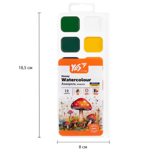 Акварельні фарби ТМ Yes Orange Line – чудовий вибір для юних художників, які починають свій шлях у світі творчості. Фарби поєднують у собі високу якість і безпеку, що робить їх ідеальним варіантом для дитячого садка, школи або домашнього використання. Виготовлені на основі натуральних матеріалів і пігментів, не містять шкідливих речовин, тому вони абсолютно безпечні для дітей (при використанні за призначенням). Завдяки меду в складі, акварельні фарби ТМ Yes Orange Line мають яскраві та насичені кольори, легко змішуються між собою та легко наносяться на папір. Пластикова упаковка акварелі ТМ Yes Orange Line має зручну, ергономічну форму. У кюветах для фарби передбачені заглиблення, що забезпечує комфортне використання та чисту поверхню пластикової основи. Гладка поверхня між комірками дозволяє легко очищати фарби вологою серветкою. При випадковому забрудненні кювети з фарбою іншим кольором, її можна легко відновити, промивши за допомогою пензлика чистою водою. Фарби акварельні ТМ Yes Orange Line ідеальні для художників-початківців.