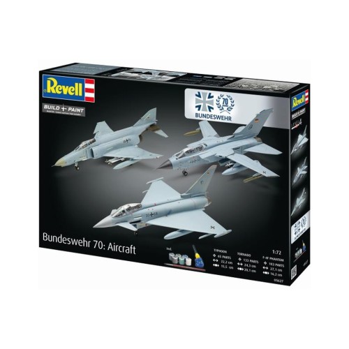 Історія німецьких ВПС тісно пов'язана з розвитком сучасних авіаційних технологій. З моменту свого заснування в 1956 році ВПС перетворилися на одну з найсильніших військово-повітряних сил Європи. Моделі, що входять до цього набору, є віхами цього розвитку: універсальний винищувач «Tornado» та один з найсучасніших багатоцільових винищувачів «Eurofighter Typhoon» відображають технологічний прогрес. «Phantom» F-4 був основою ВПС протягом десятиліть і вважається символом сили та надійності. З цим набором ви можете привезти частинку цієї вражаючої історії додому та на власні очі відчути еволюцію військової авіації.Подарунковий набір «70 років Збройних сил Німеччини» був спеціально розроблений, щоб зробити ваш процес моделювання максимально приємним. Незалежно від того, новачок ви чи досвідчений моделіст, базові фарби, клей та пензлик, що входять до комплекту, забезпечать все необхідне для негайного початку роботи. Літаки Eurofighter Typhoon, Phantom та Tornado є одними з найвідоміших моделей сучасних німецьких ВПС та є важливими віхами в німецькій військовій історії.