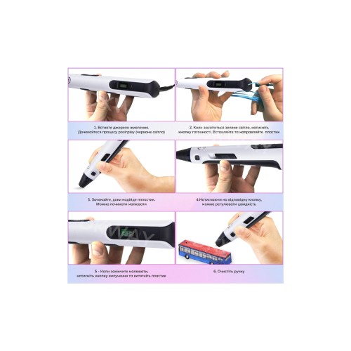 Візьміть пластик рівним кінцем і вставте його в отвір, щоб завантажити пластик. Натисніть і утримуйте кнопку подачі пластику, поки пластик не вийде з сопла. Ручка готова до використання.