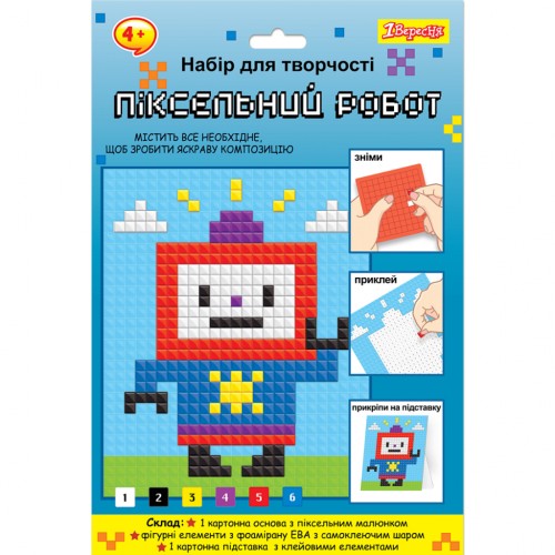 Набір для творчості 1Вересня "Піксельний Робот". Картонна основа з піксельним малюнком та фігурні елементи з фоамірану ЕВА з самоклеючим шаром дозволяють зробити яскраву аплікацію. Робота з набором розвиває уяву, творче мислення дитини, увагу та дрібну моторику. Матеріал: картон, фоаміран ЕВА.