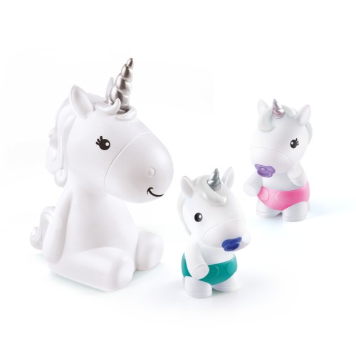 В наборі: Light Up великий єдиноріг, 2 маленьких єдинороги, які світяться у темряві, 3 аркуші з гліттер стікерами, 2 маркери.