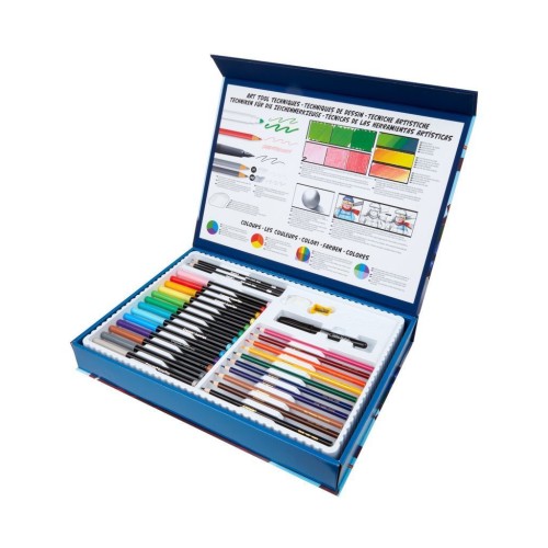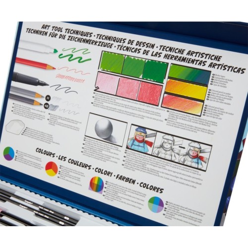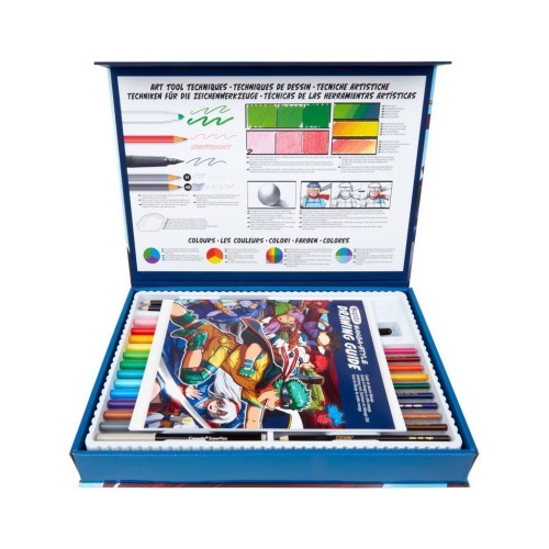 Цей унікальний набір містить 10 кольорових олівців, 13 маркерів Supertips, 2 олівці для ескізів, 1 перманентний маркер, 1 точилка для олівців, 1 ластик, 10 сторінок високоякісного паперу для малювання, 5 аркушів кальки, а також посібник як малювати аніме та мангу.