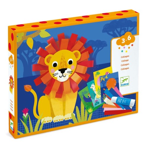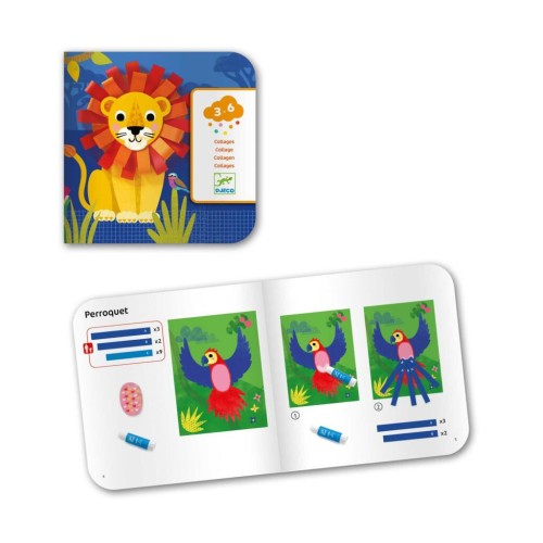 4 ілюстровані зображення (21 x 28 см), 82 паперові різнокольорові смужки, 4 картонні фігурки тварин, клей олівець, буклет із креативною ідеєю