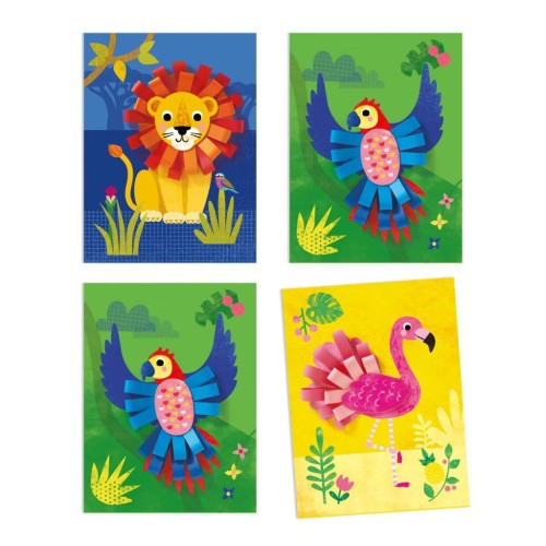 Творчий набір для дітей, в якому дитина може створити 4 великих зображення з тваринами. Складаючи і склеюючи різнокольорові смужки паперу, дитина змайструє красиву левову гриву, яскравого папугу, чудове оперення фламінго і чудове пальто для лами.