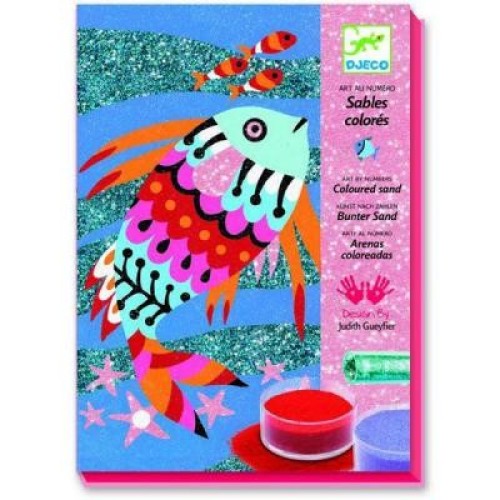 Художній комплект малювання кольоровим піском і блискітками Djeco Райдужні рибки - набір для створення картинок за допомогою кольорового піску і блискіток. Цей набір призначений для створення красивих яскравих картин, якими діти будуть пишатися і зможуть повісити у себе в кімнаті. Малювання піском - це ігрове і художнє заняття, що сприяє розвитку почуття гармонії, спритності рук і креативності.