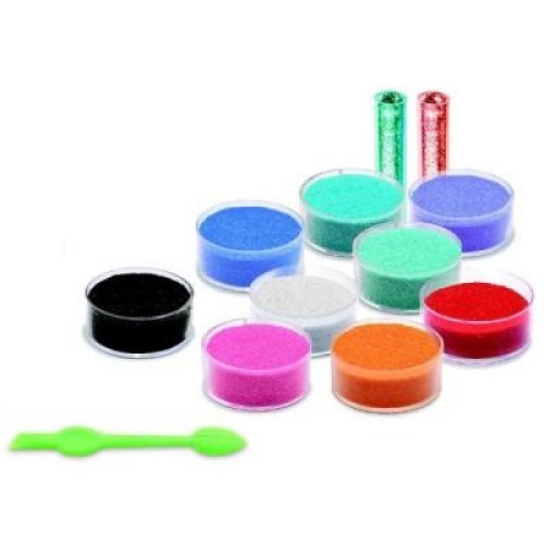 9 банок з різноколірним піском, 2 баночки з блискітками, 4 картинки-тло, шпатель