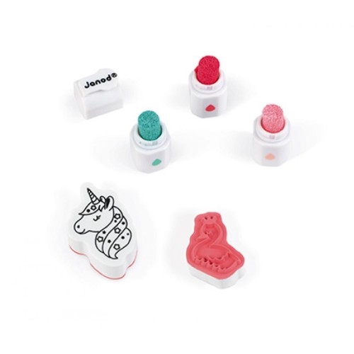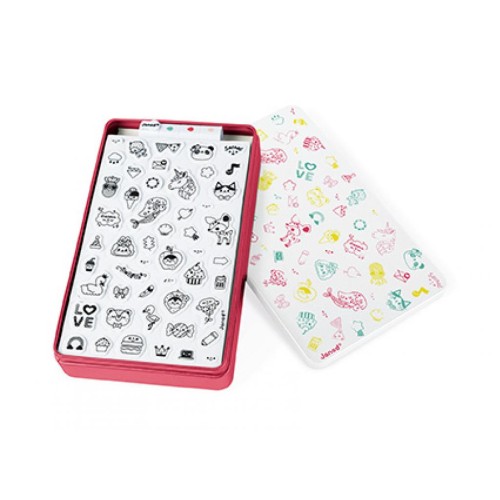 Набір для творчості Штампи Смайли від французького бренду Janod містить лист з 50 невеликих, попередньо вирізаних, пінопластових штампиков з різною графікою, на тему емоцій і в тому числі милих тварин, веселки, сердечок, делікатесів і єдинорогів. Штампи зроблені з приємного на дотик еластичного пінопласту і гумової поверхні, на якій нанесено зображення штампування. У набір також входять три маленькі чорнили у вигляді маркерів: блідо-рожевий, темно-рожевий і блакитний. Завдяки їм один штампик може бути пофарбований в кілька кольорів одночасно. Також в комплекті є коробка, в якій можна зберігати штампи і фарбу.