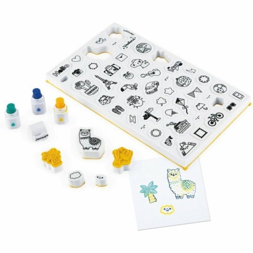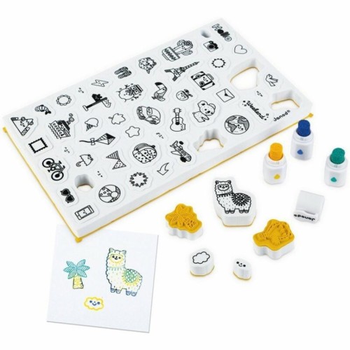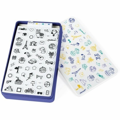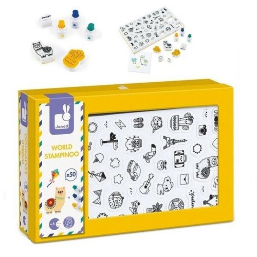 Набір для творчості Штампи Світ від французького бренду Janod містить лист з 50 невеликих, попередньо вирізаних, пінопластових штампів з різною графікою, на тему подорожей по всьому світу. Штампи зроблені з приємного на дотик еластичного пінопласту і гумовою поверхнею, на якій нанесено зображення штампування. У набір також входять три маленькі чорнила у вигляді маркерів: жовтий, темно-синій і бірюзовий. Завдяки їм один штампік може бути пофарбований в кілька кольорів одночасно. Також в комплекті є коробка, в якій можна зберігати штампи і фарбу.
