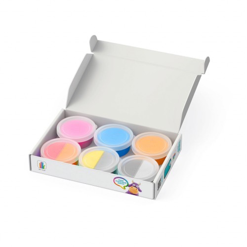 • В набір може входити до 12 різних кольорів (баночка може містити пластилін двох різних кольорів).