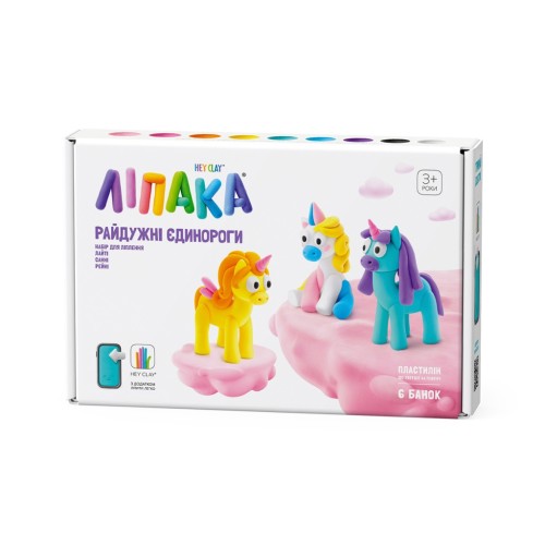 Набір пластиліну, що самостійно твердіє, ЛІПАКА - РАЙДУЖНІ ЄДИНОГОРИ: ЛАЙТІ, САННІ, РЕЙНІ – розважить і малюків, і дорослих. За допомогою анімаційних інструкцій в застосунку HEY CLAY, ви зможете зліпити трьох кумедних тваринок. Пластилін твердіє на повітрі протягом 24 годин, після чого можна гратися створеними фігурками.