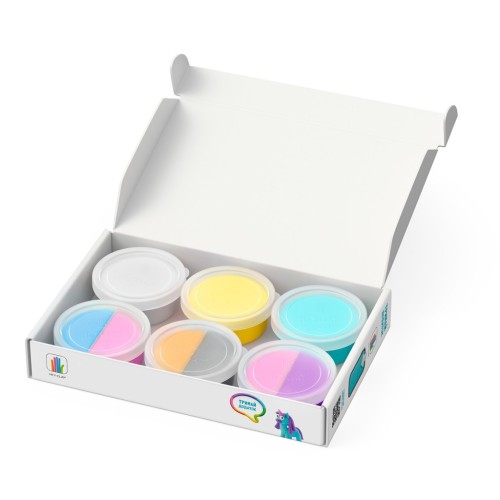 • В набір може входити до 9 різних кольорів (баночка може містити пластилін двох різних кольорів).
